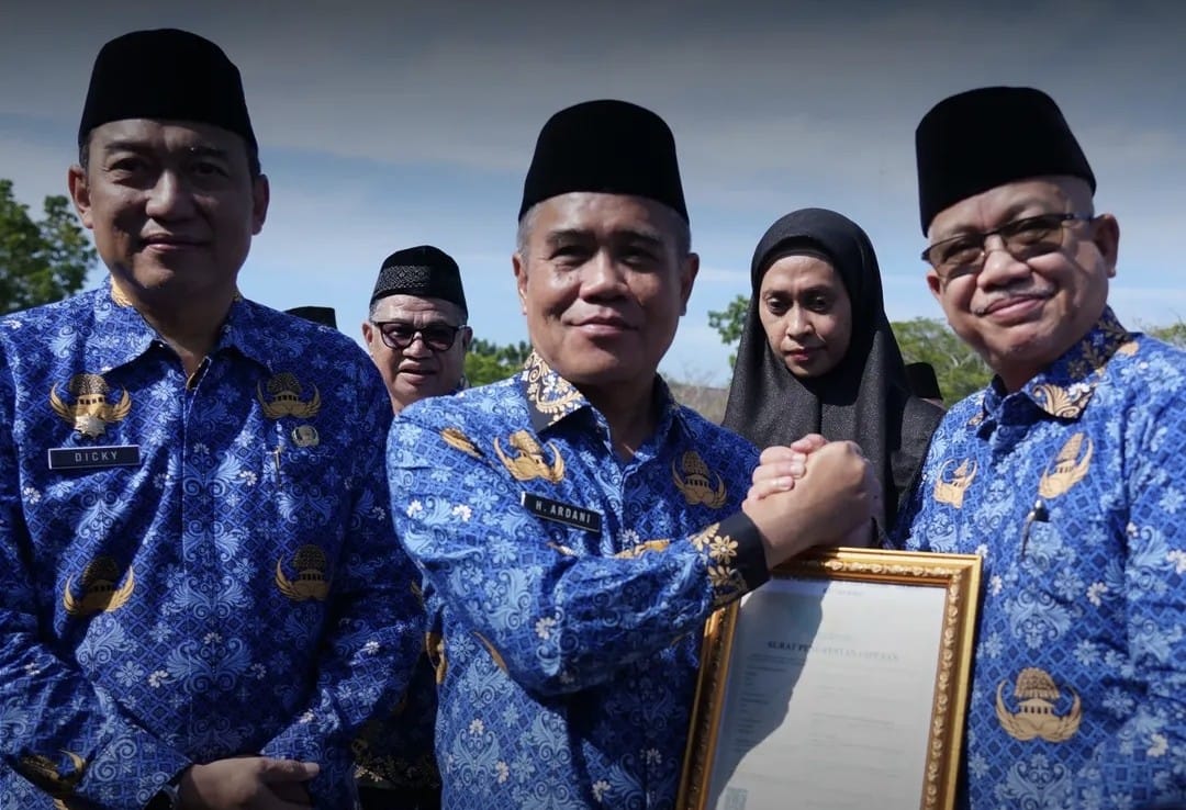 Penyerahan SK Plh Sekda Ogan Ilir diserahkan kepada Dicky Syailendra oleh Wakil Bupati (Wabup) Ogan Ilir H Ardani SH usai melaksanakan upacara Senin 1 Desember 2025 di Lapangan KPT Tanjung Senai Indralaya.