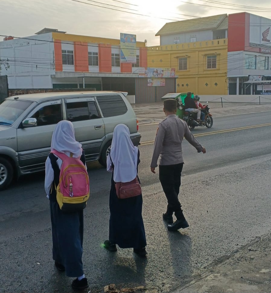 Kapolsek Indralaya AKP Junardi, S.H., M.A.P. bersama personel turun langsung ke lapangan untuk melakukan pengaturan lalu lintas serta membantu warga dan pelajar yang hendak menyeberang jalan guna mencegah terjadinya kecelakaan lalu lintas.