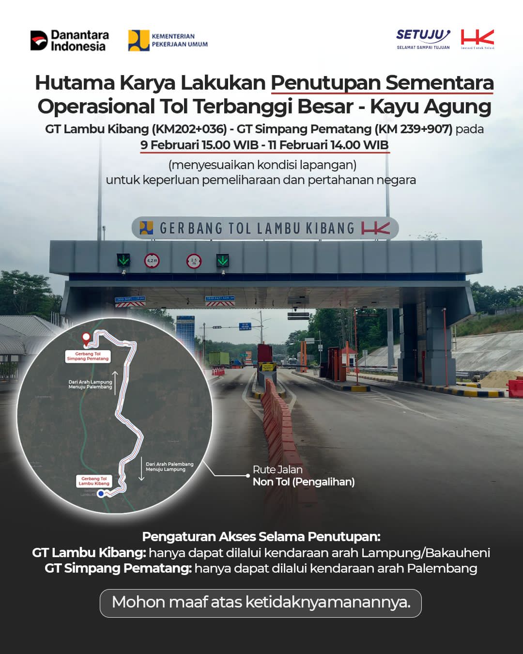 Inidianews.com -PT Hutama Karya (Persero) selaku Badan Usaha Jalan Tol (BUJT) menyampaikan bahwa operasional Ruas Jalan Tol Terbanggi Besar–Pematang Panggang–Kayu Agung akan diberlakukan penutupan sementara pada segmen Gerbang Tol Lambu Kibang (KM 202+036) sampai dengan Gerbang Tol Simpang Pematang (KM 239+907).