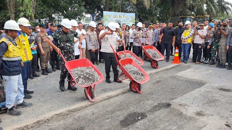 Personel Polda Sumsel bersama Forkopimda melaksanakan pembersihan sampah, penataan drainase, penambalan jalan berlubang, serta penertiban rumput liar secara serentak.
