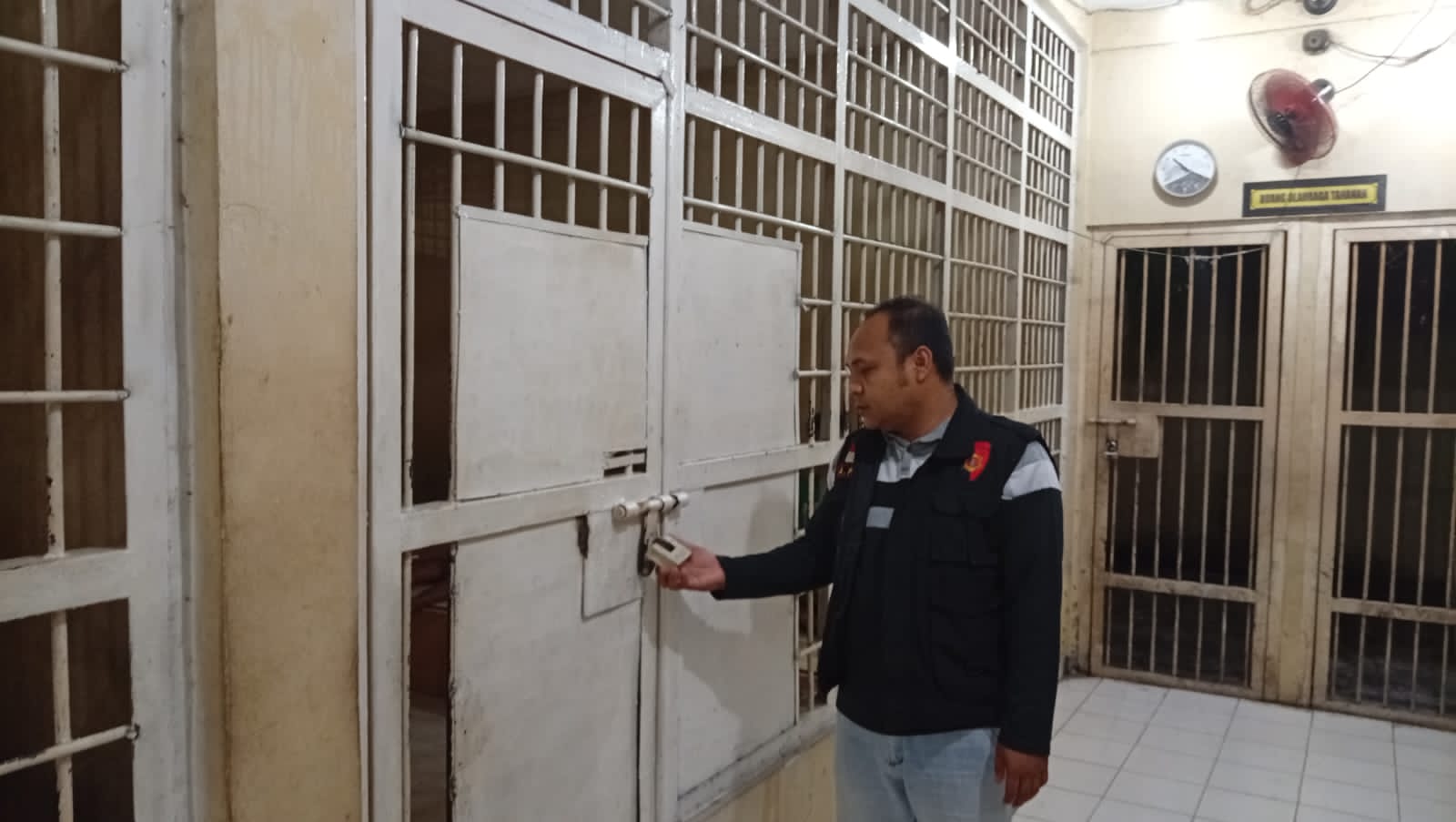 Petugas melakukan pemeriksaan secara menyeluruh meliputi pengecekan jumlah tahanan, kondisi ruang tahanan, gembok, terali besi bagian dalam dan luar, serta administrasi seperti buku mutasi dan surat perintah penahanan.