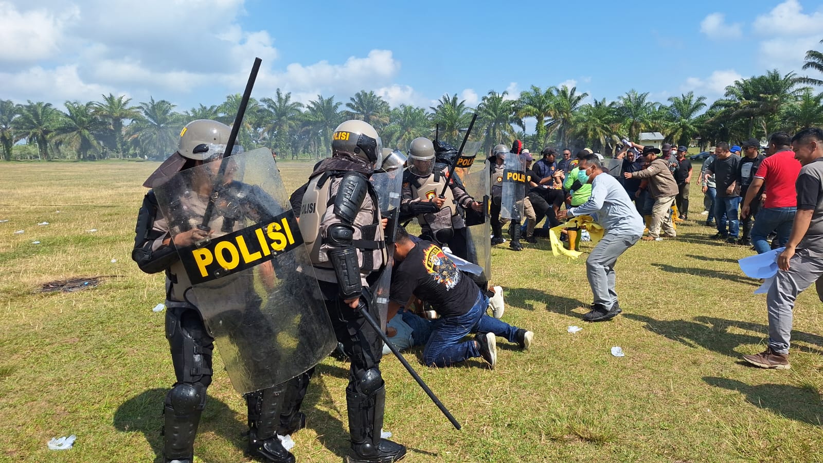 Ribuan massa yang tergabung dari elemen buruh dan sopir angkutan digambarkan melakukan aksi unjuk rasa yang awalnya berjalan kondusif, namun kemudian memanas akibat ketidakpuasan terhadap hasil mediasi. Situasi meningkat menjadi kericuhan dengan aksi pembakaran ban, dorong-mendorong, hingga pelemparan terhadap petugas.